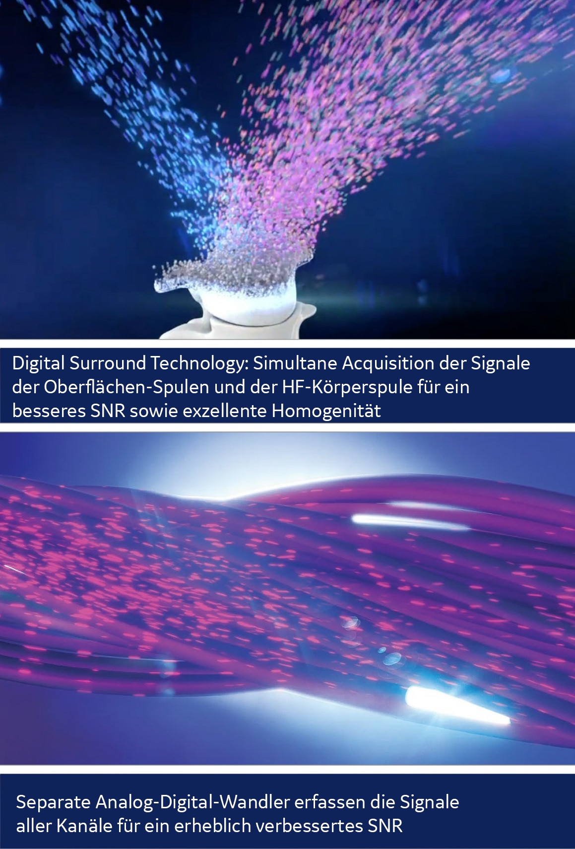 Digital Surround Technology (DST) kombiniert das bessere Signal-/Rauschverhältnis samt höherer Empfindlichkeit der Oberflächenspulen mit der exzellenten Homogenität und hervorragenden Signaleindringtiefe der integrierten HF-Körperspule, um detailgetreuere, schärfere Bilder von höherer Qualität zu erzeugen.